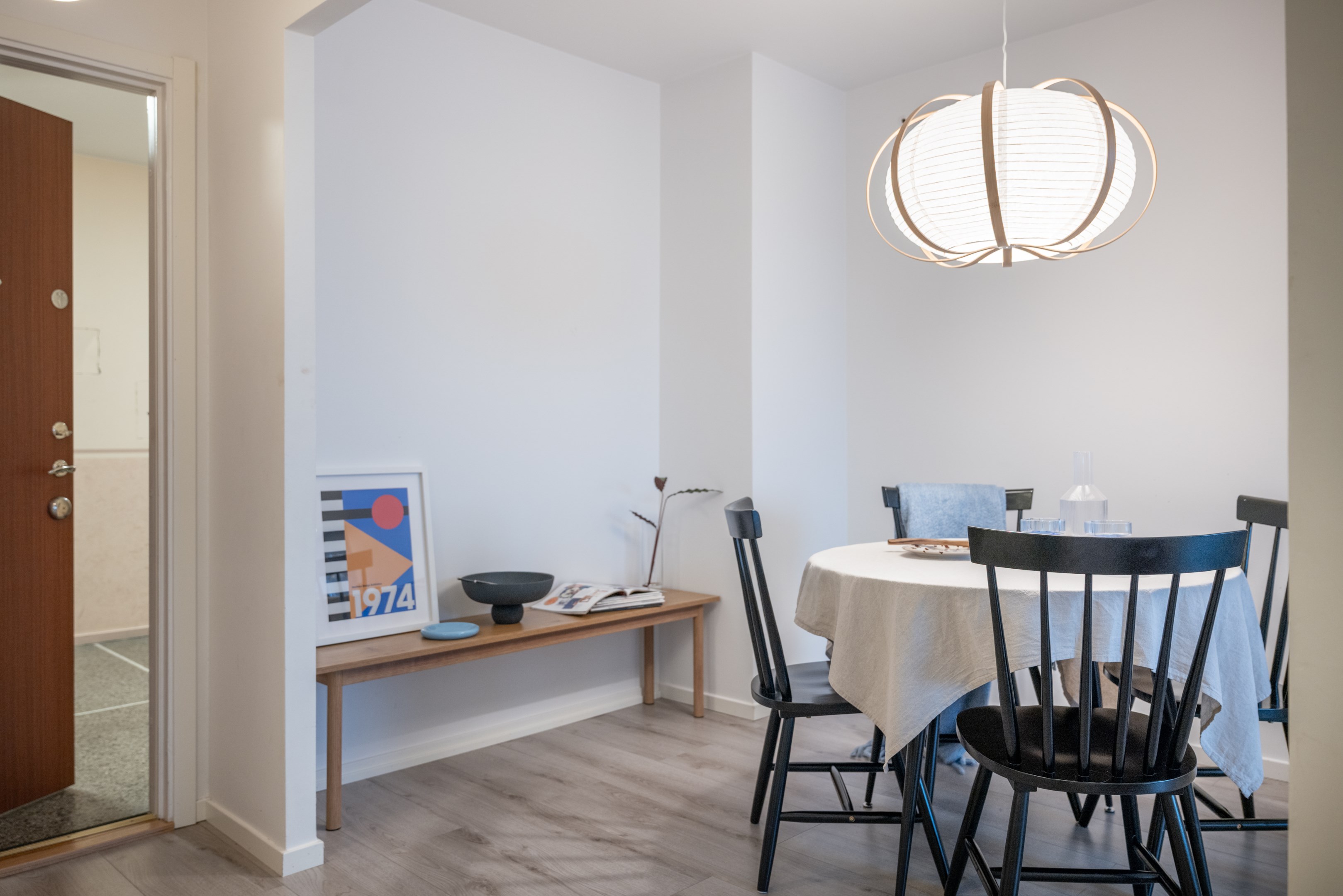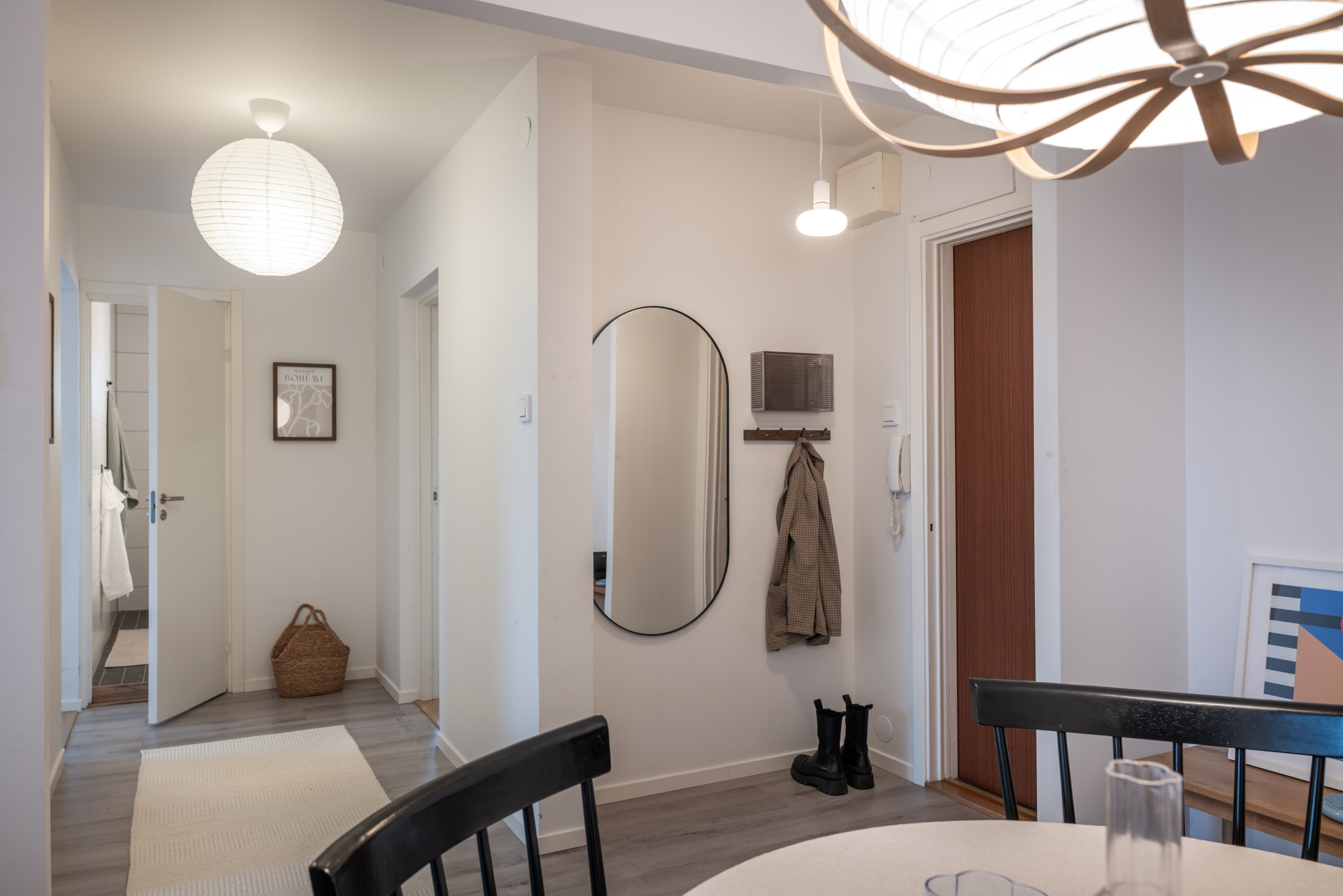 Vid entrén öppnar sig en rymlig och ljus hall med vita väggar och golv i tåligt laminat, som tillsammans skapar ett stilrent och välkomnande första intryck. Här leder den smidiga planlösningen enkelt vidare till bostadens övriga rum.