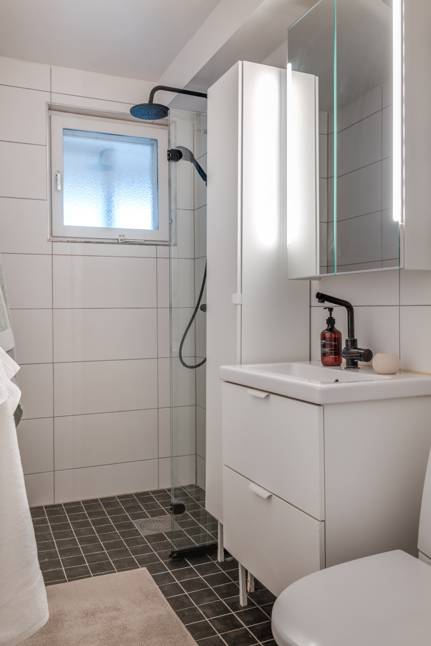 Badrummet är rymligt och har ett fönster som ger naturligt ljus. Badrummet är helkaklat i vitt och golvet belagt med grått klinker, vilket skapar en fräsch och lättskött yta samt bra med förvaringsmöjligheter.