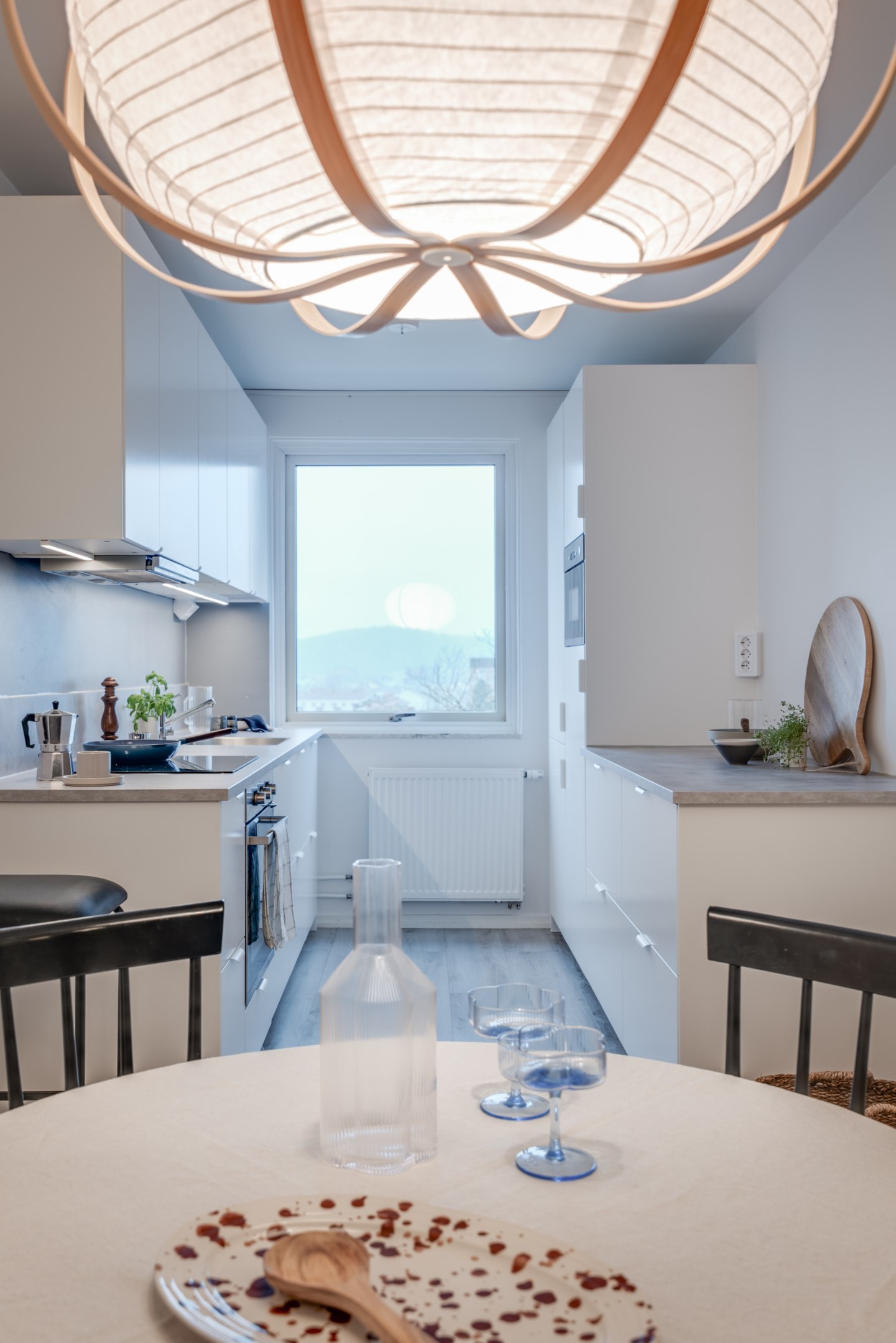 Köket är omgjort och total nyrenoverat år 2023, välplanerat med goda arbetsytor och generösa förvaringsmöjligheter. Här finns all nödvändig utrustning för en bekväm vardag, inklusive moderna vitvaror och praktiska lösningar som underlättar matlagningen. Skåpen är vita med rostfria detaljer, vilket ger en ljus och modern känsla. Den öppna ytan ger plats för ett matbord med flera sittplatser, vilket gör köket till en naturlig samlingspunkt i bostaden.