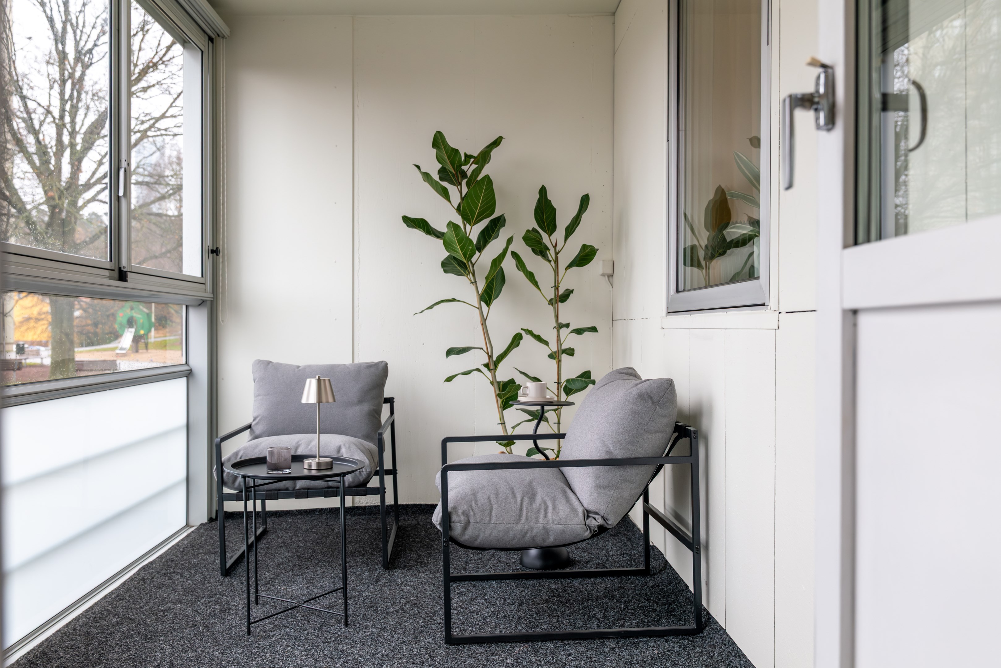 Från vardagsrummet nås den inglasade balkongen som ligger i skyddat läge. Här finns gott om utrymme för sittmöbel eller bord och möjlighet till extra förvaring. Den inglasade utformningen gör balkongen användbar under större delen av året och skapar en trevlig plats att vistas på oavsett väder.
